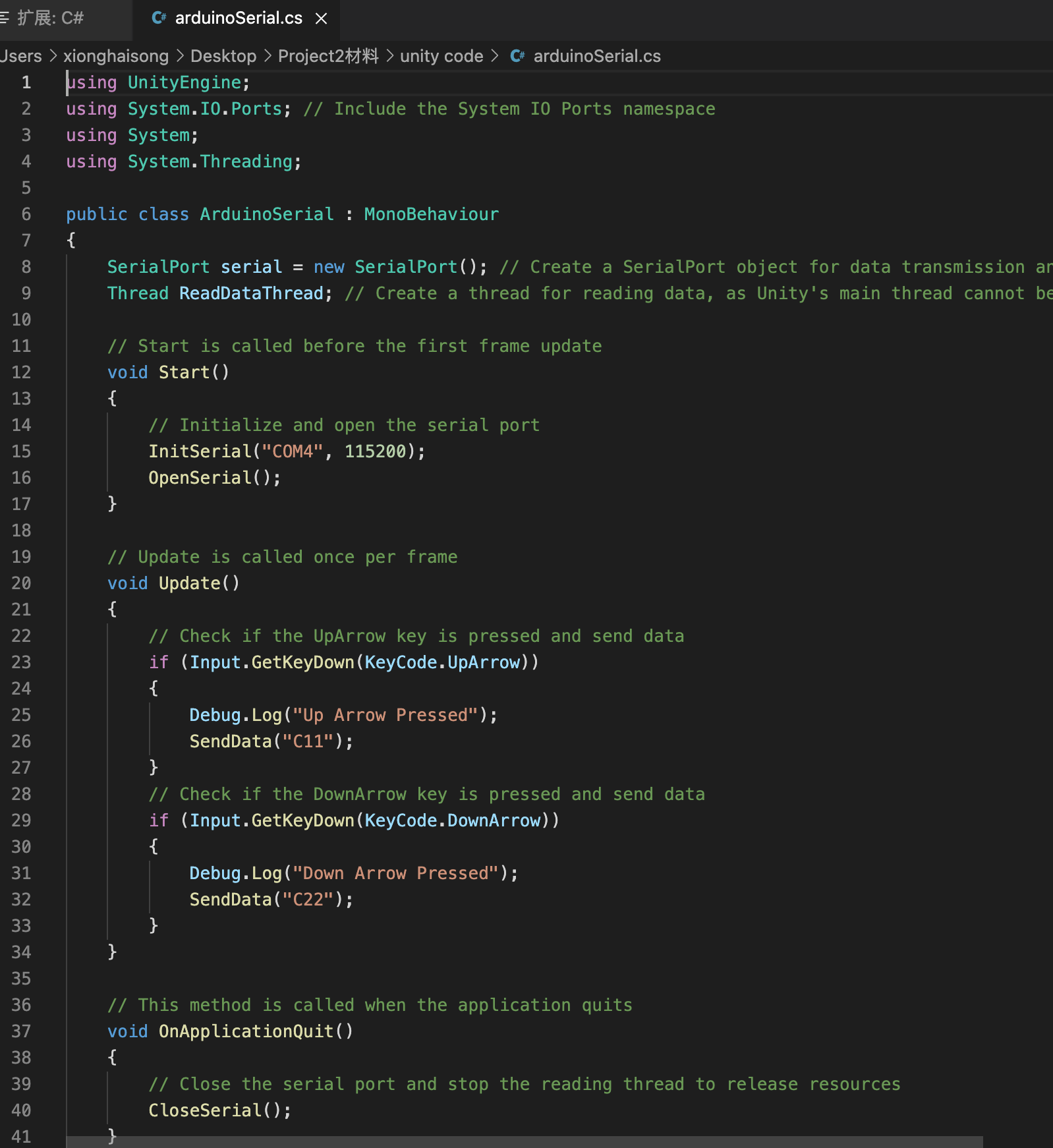 The user inputs action commands on the computer, and Unity simultaneously transmits these commands to both the virtual side (Unity 3D) and the physical side (Arduino), controlling the movement of the first-person perspective in the virtual environment and the vibration of the wearable device on the physical side. When the user stops inputting action commands, the movement in the virtual environment and the vibration of the wearable device will also cease.